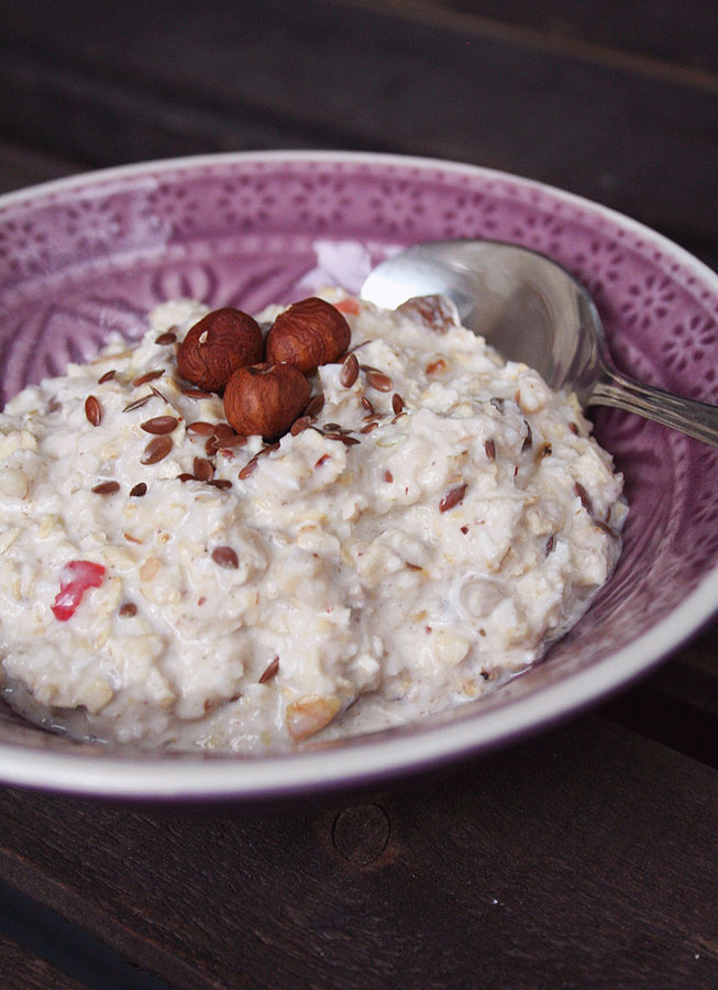 1) Haselnüsse zerschneiden. Die Birne und den Apfel waschen, in Viertel schneiden, entkernen und raspeln. 2) Gebt alle Zutaten in eine Schüssel und rührt alles gut durch. 3) In eine Aufbewahrungsdose geben und über Nacht in den Kühlschrank stellen. Das Müsli zieht gut durch und ist eine Woche haltbar. Am Morgen mische ich noch einen Teelöffel Leinöl oder Kokosöl unter meine Portion.